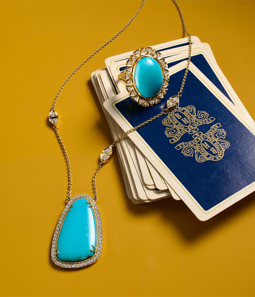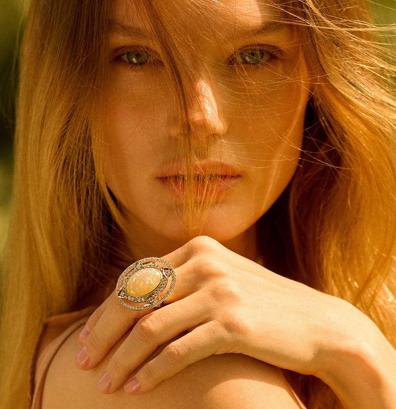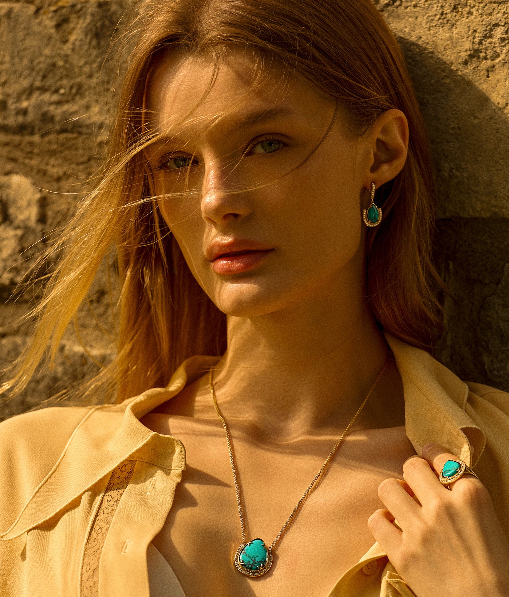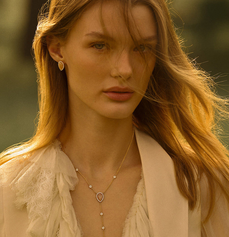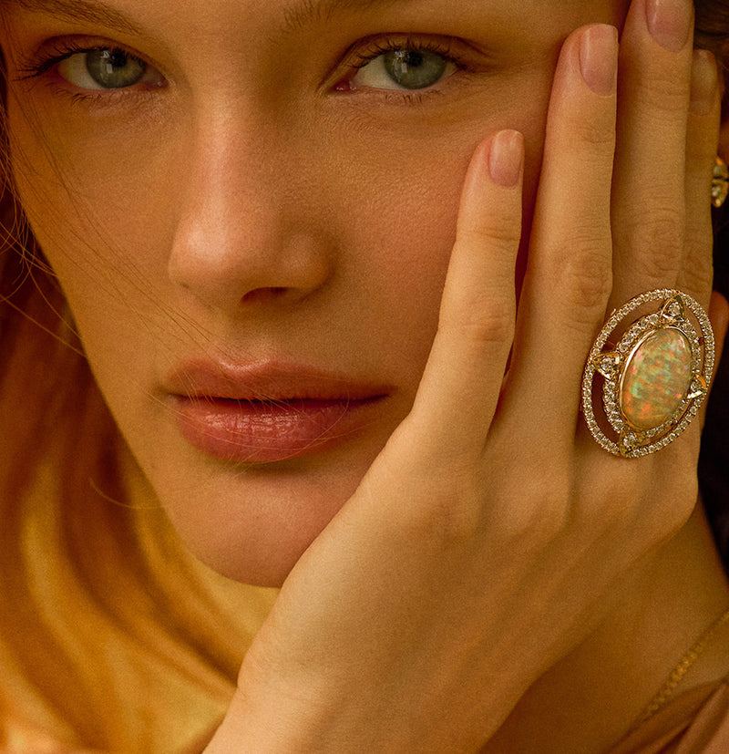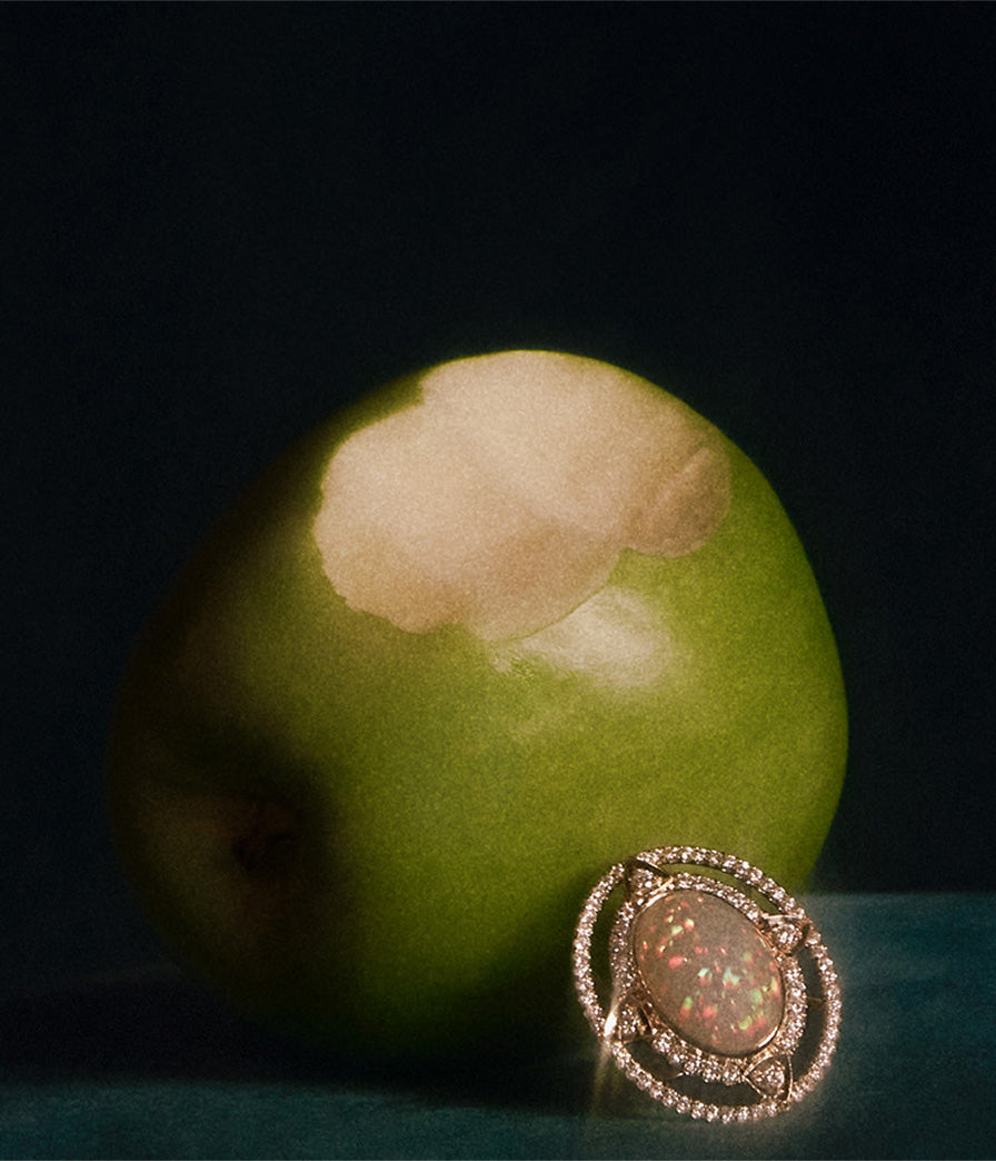 The Commodore Perry Estate, tucked into Austin’s historic Hyde Park neighborhood, is the backdrop to our latest campaign. Here, storybook details and floral inlaid limestone accent formal gardens interwoven with wild oak trees. It’s a postcard from the Roaring Twenties, when flappers mingled with ranchers at lavish parties on the edge of the wild. A modern sensibility now accents this patina of the past, where our shimmering opals and alluring diamonds tell a tale all their own.