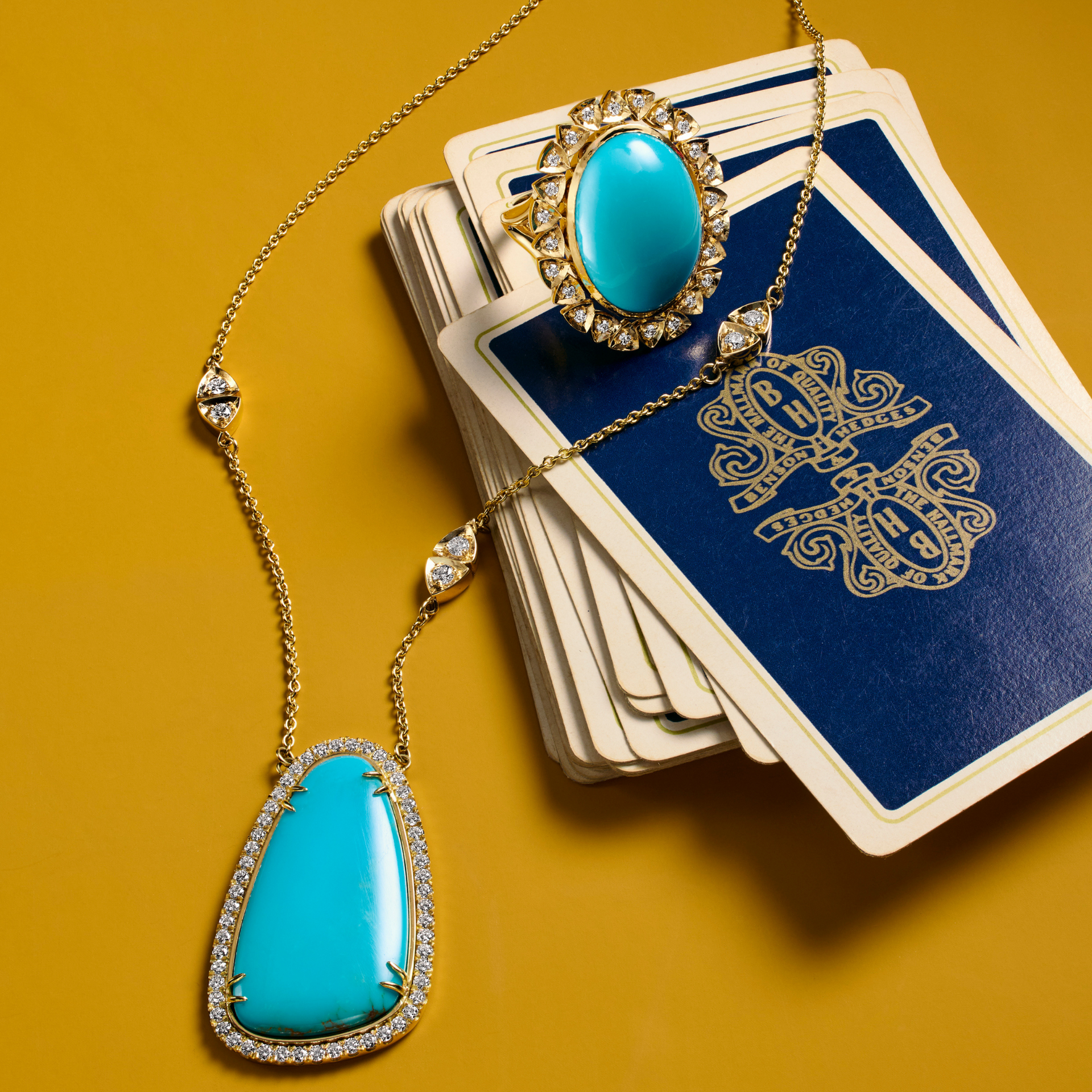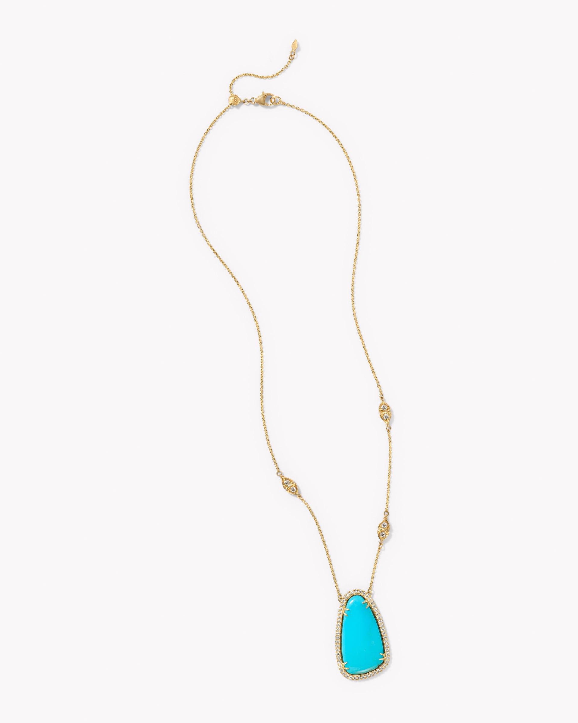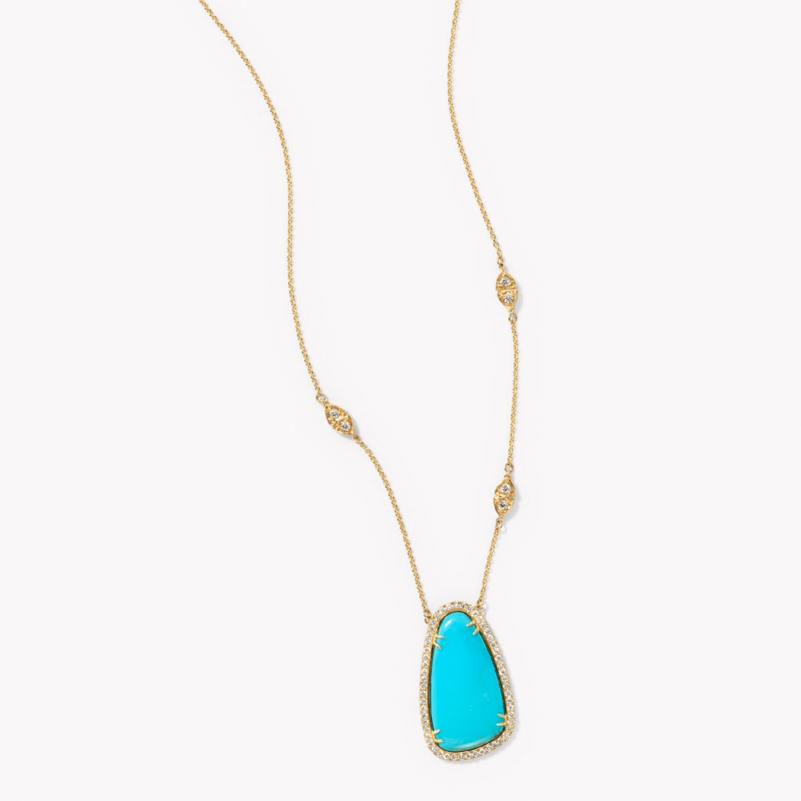 Featuring a luminous Turquoise stone cradled in a delicate gold setting, the Calista Pendant glows against the skin.