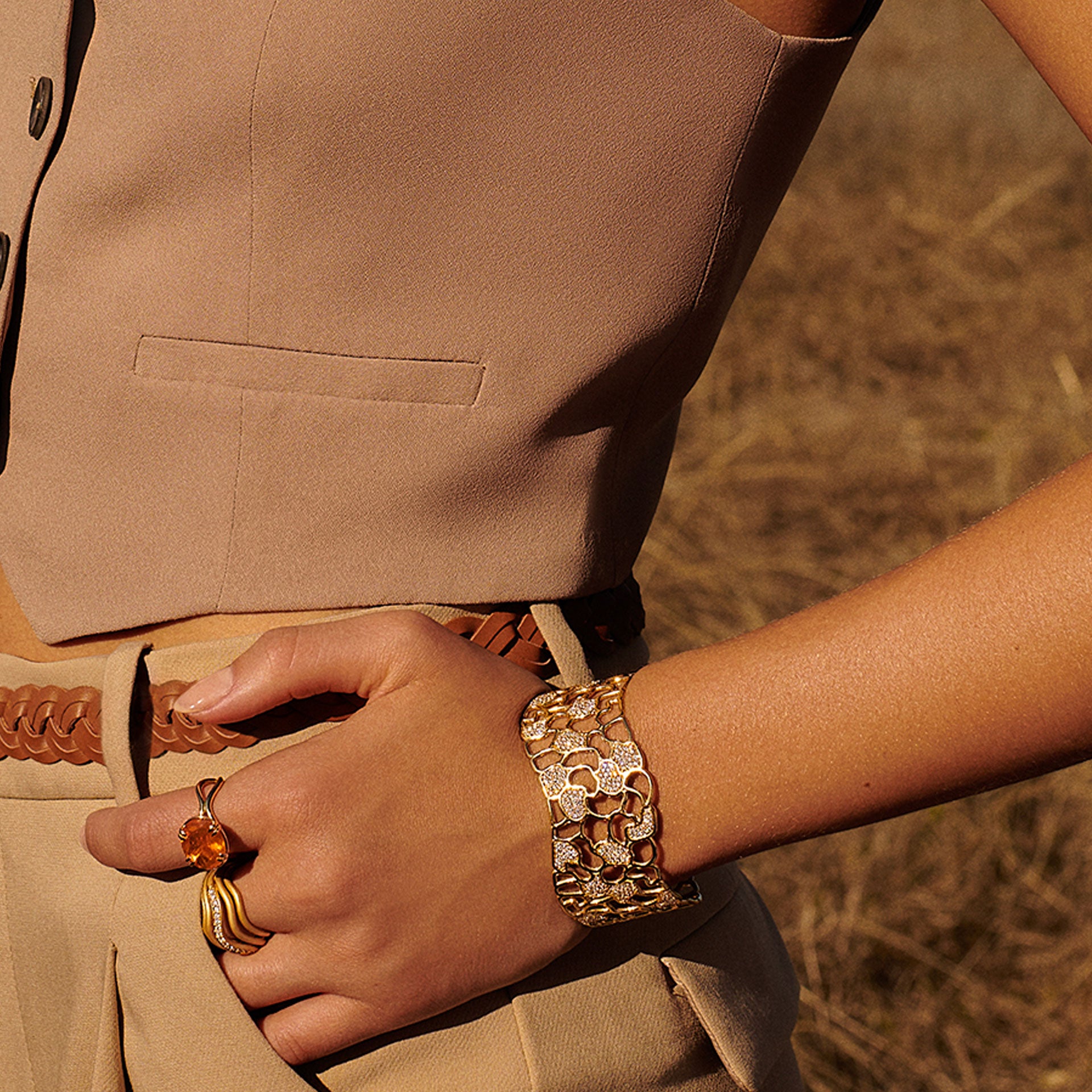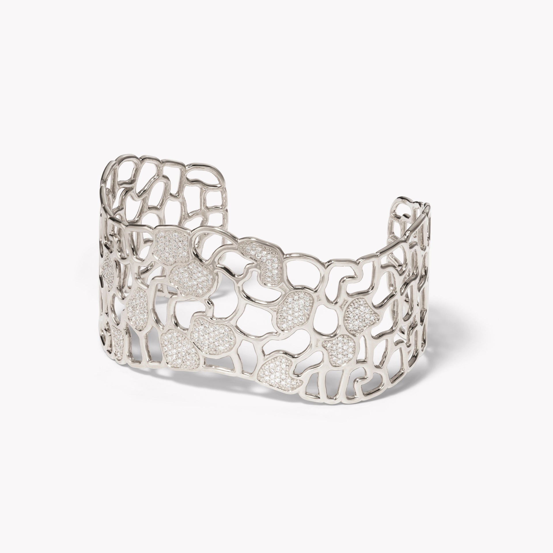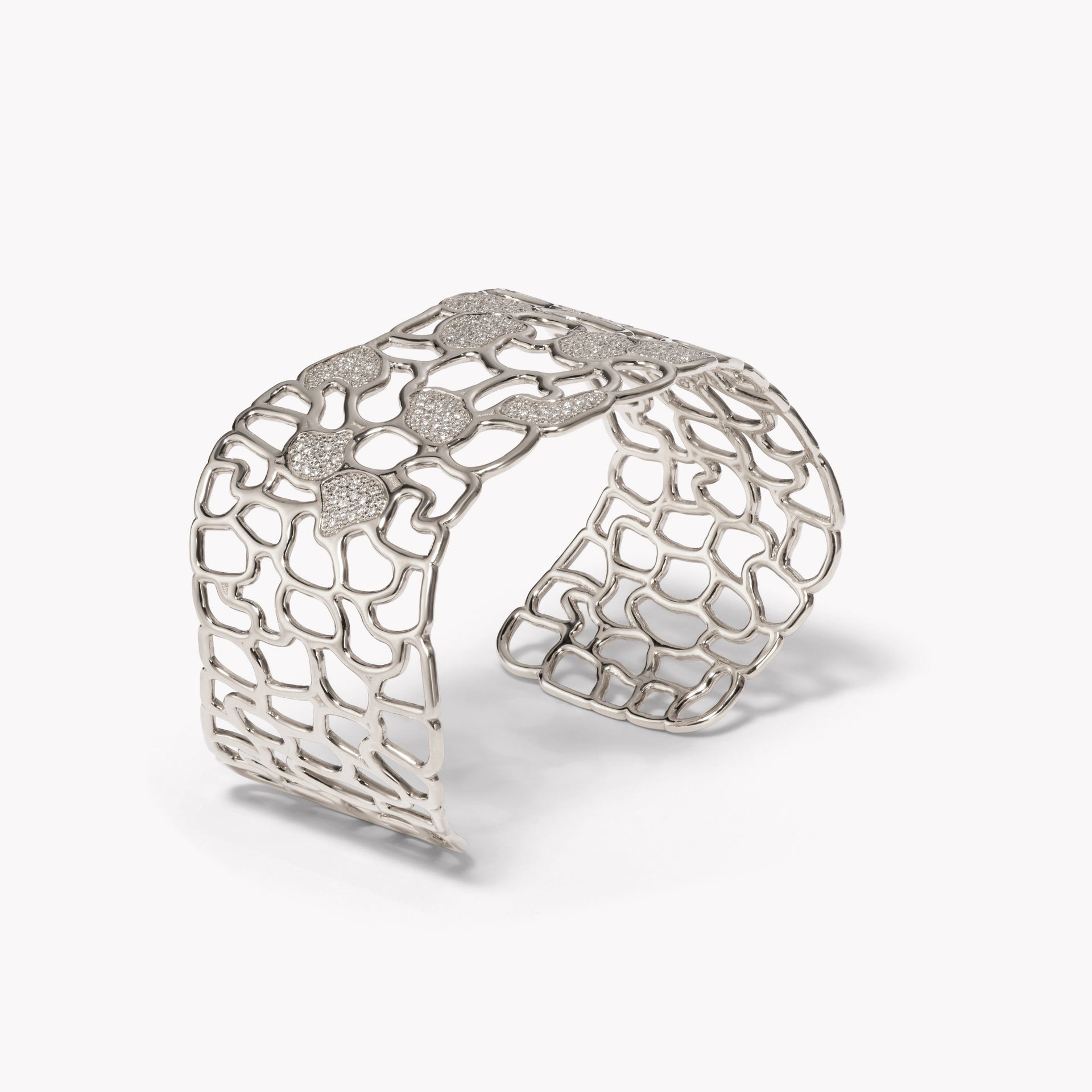 Our elevated take on the classic cuff silhouette, this piece includes the brilliance of diamonds that shine on every twist and turn of the wrist. A wearable work of art that seamlessly blends avant-garde style with timeless luxury.