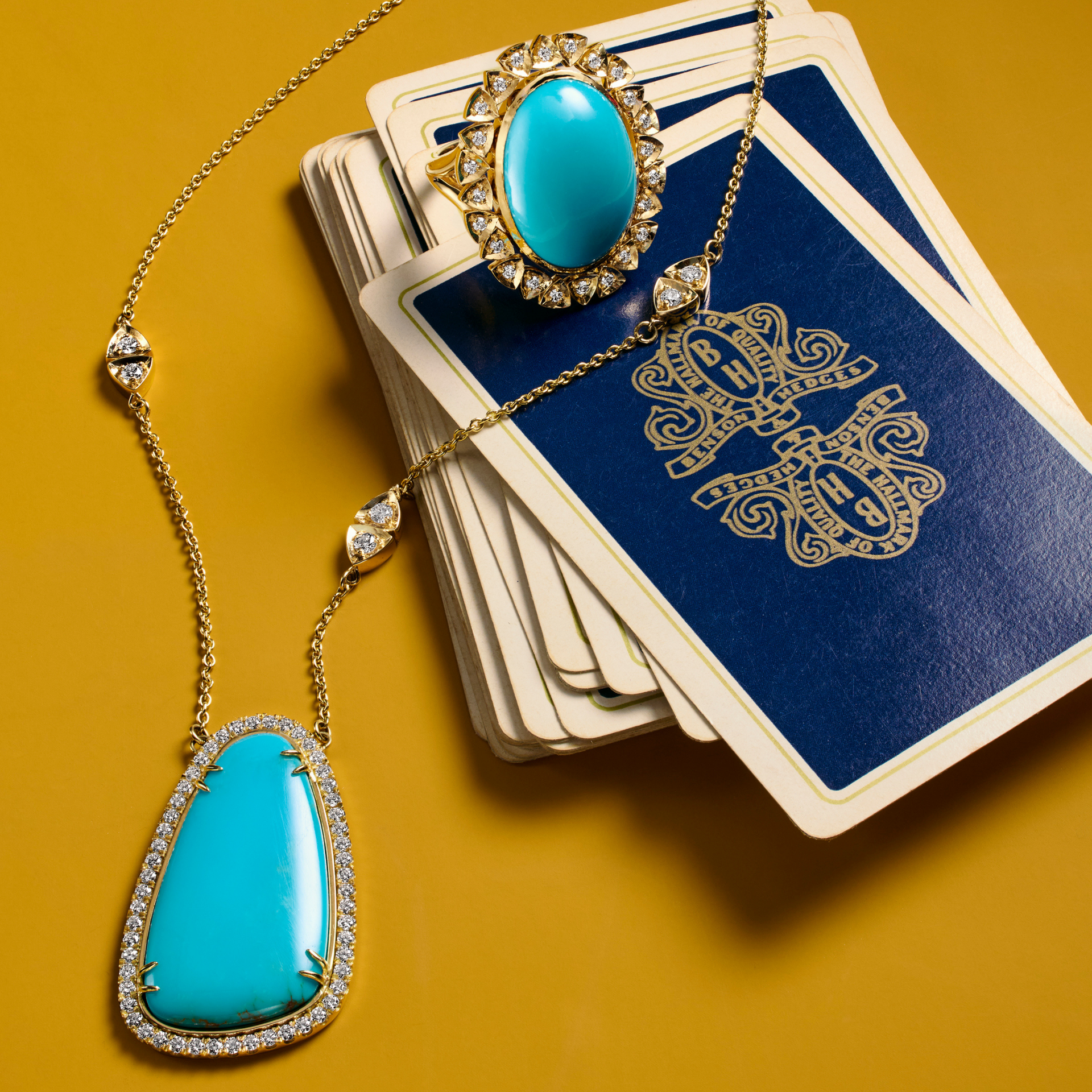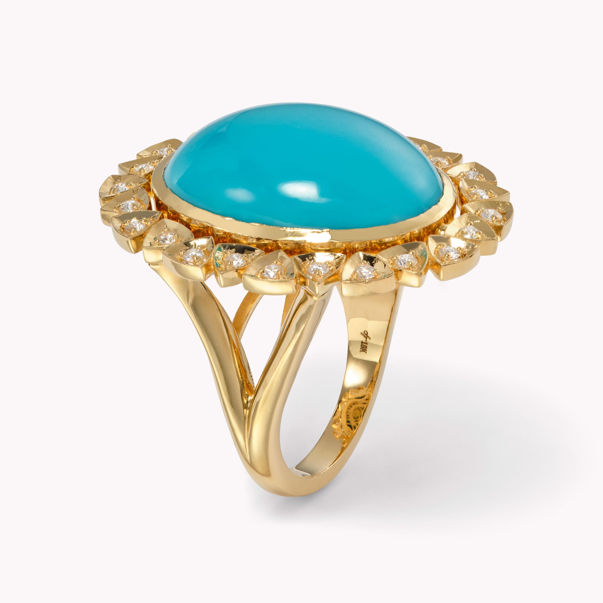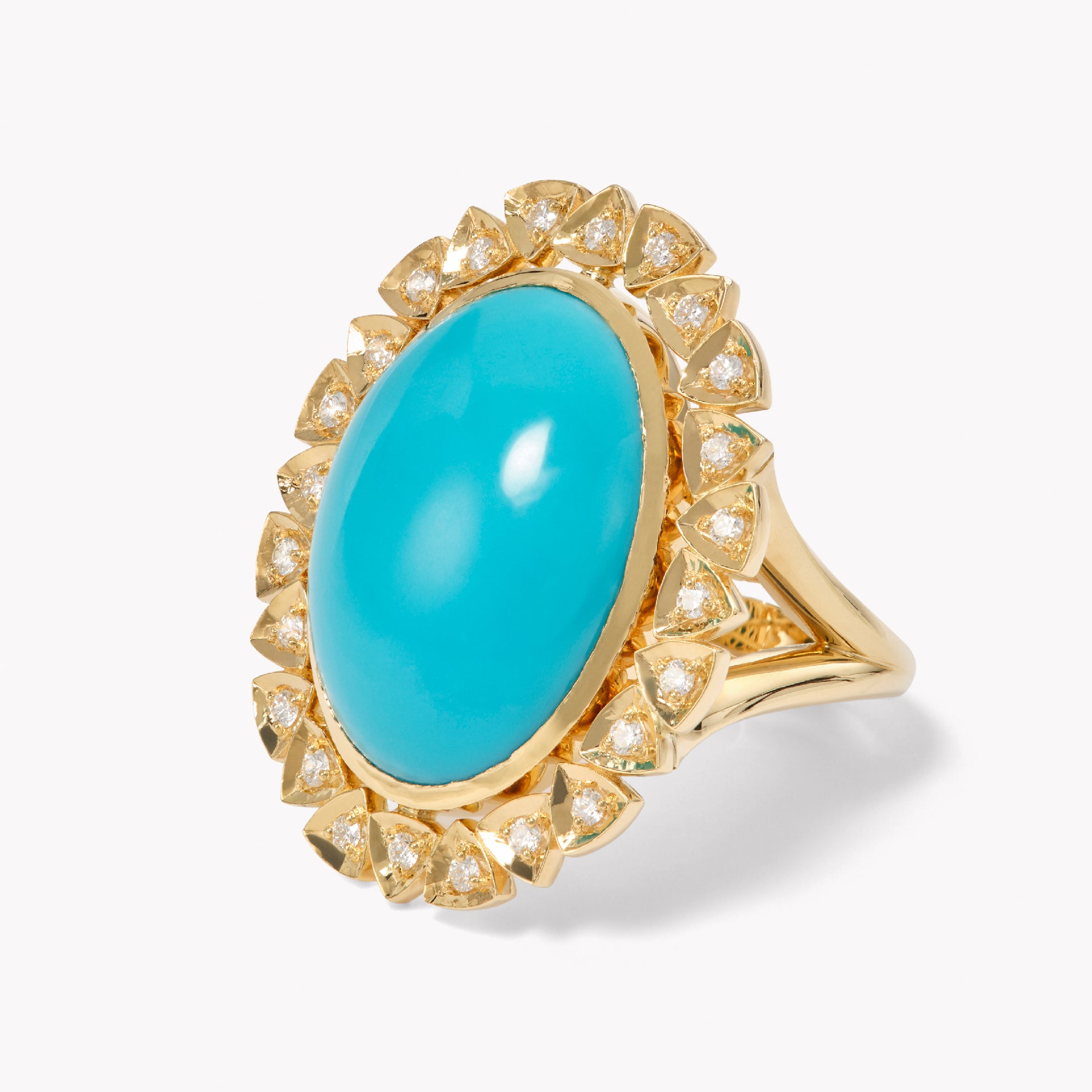 The Della Turquoise Cocktail Ring is a romantic ode to old-world elegance, with a radiant Turquoise stone nestled in a halo of golden, trillion petals.