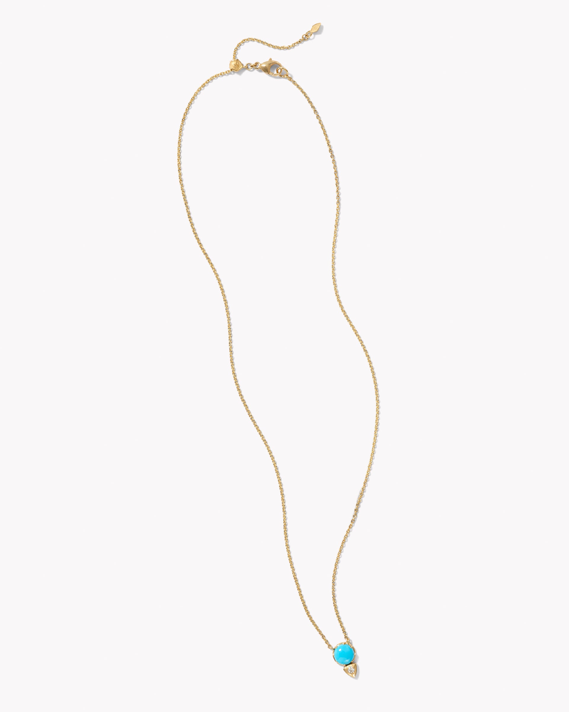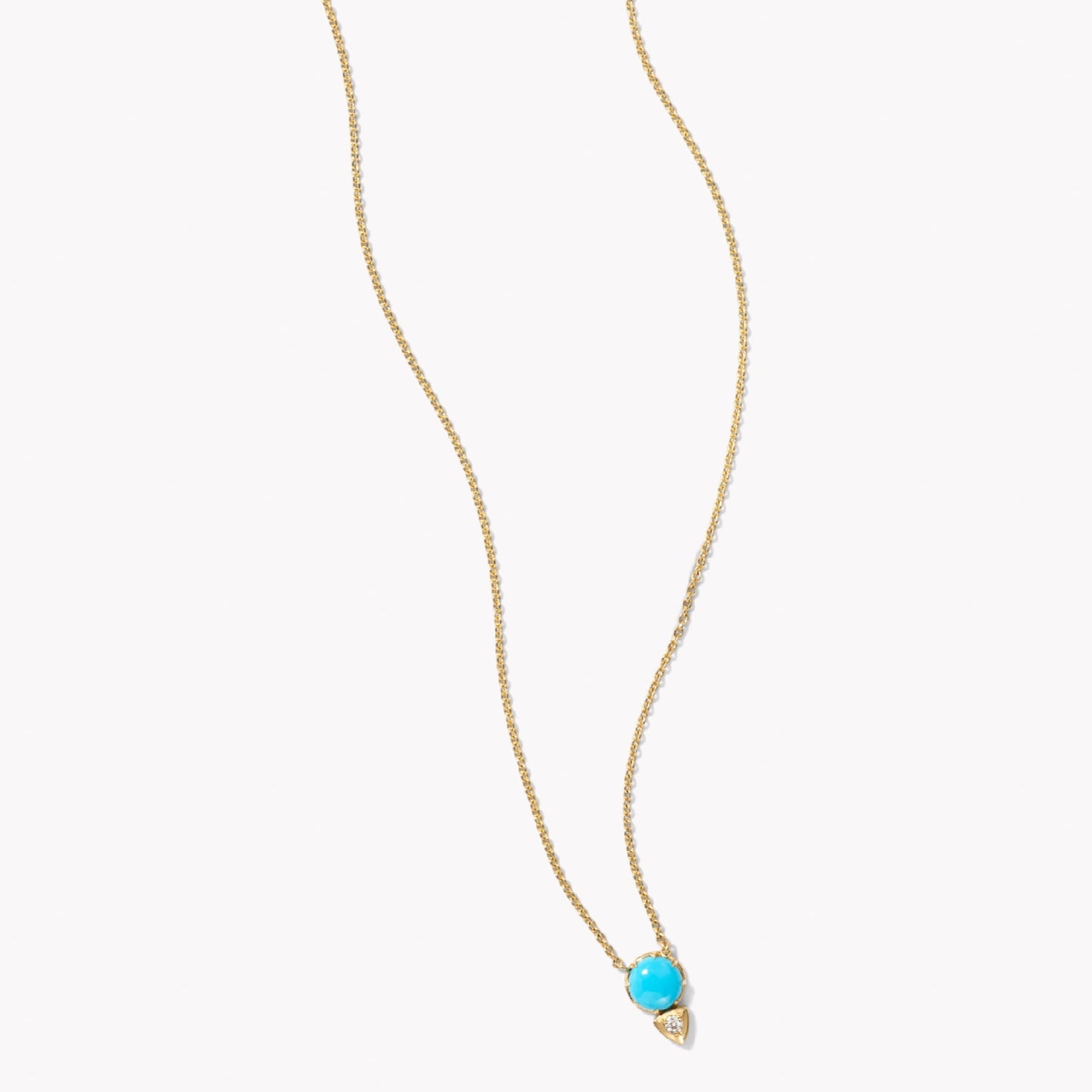 Resting perfectly on the apex of a delicate gold chain, this Ellis Turquoise pendant is subtle yet impactful. With a brilliant blue Turquoise stone, accented by a trillion diamond, and wrapped in 18k gold, this necklace is a true staple.
