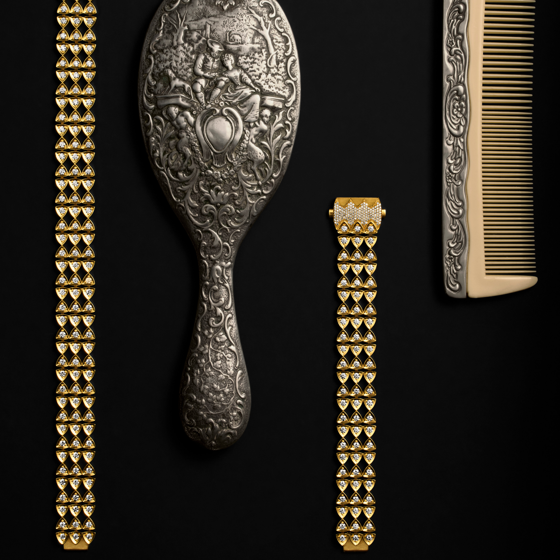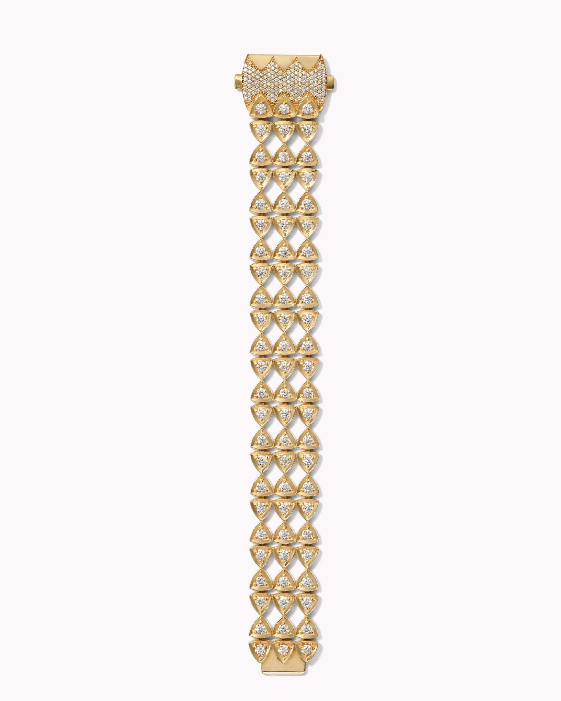Powerfully wrapping the wrist, this bracelet is the perfect combination of patterned trillions and diamonds and elegant 18k gold shimmer, connected by a paved clasp.
