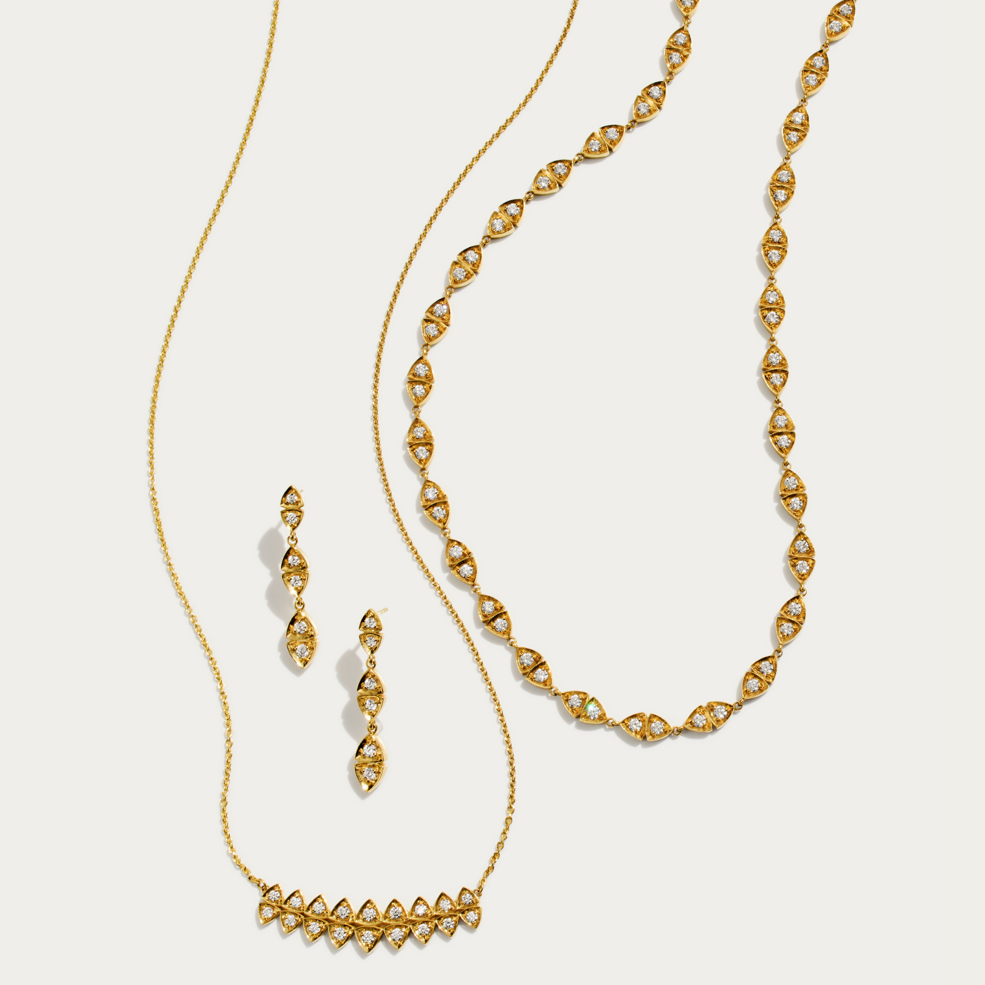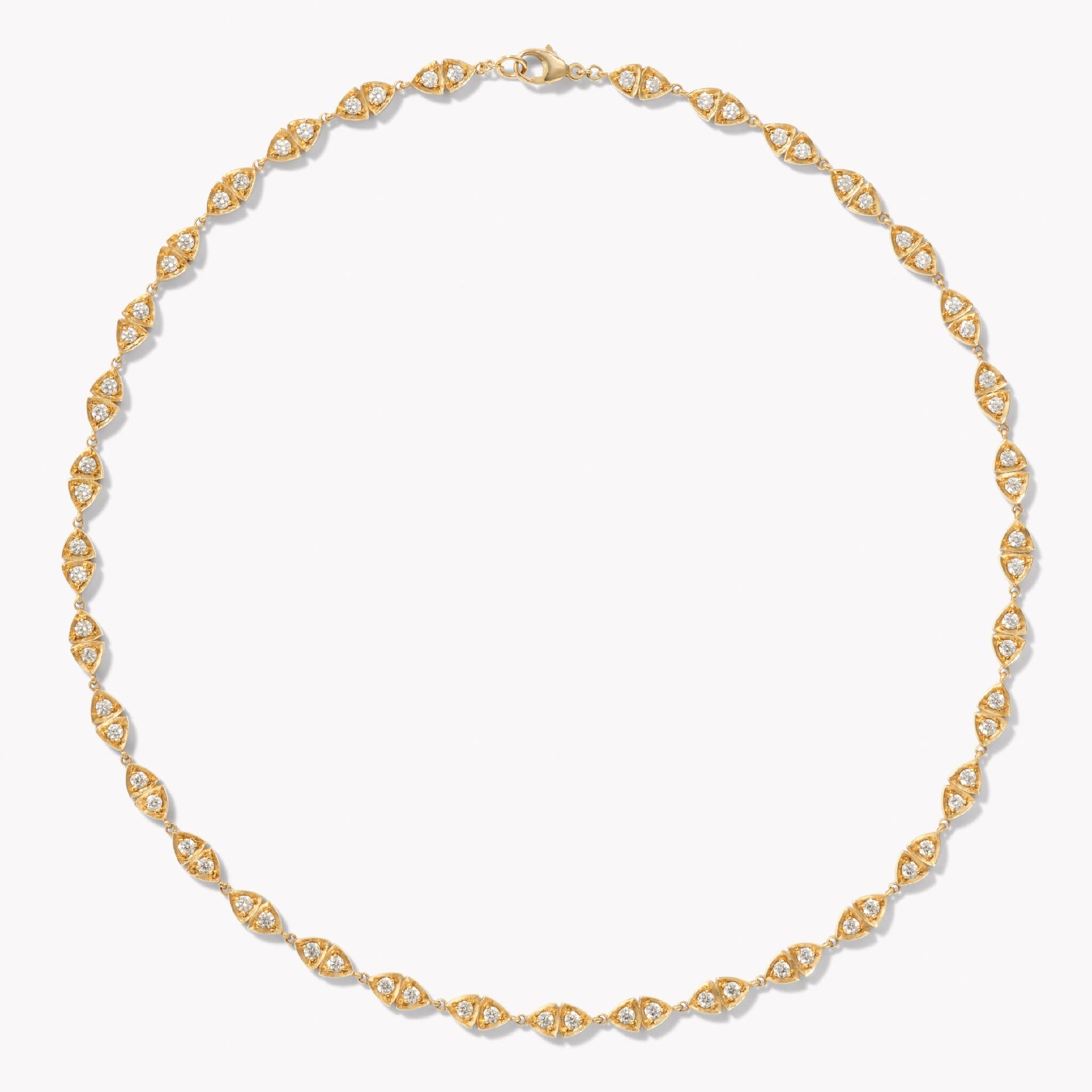 Articulating pairs of solid gold trillions and diamonds in 18k gold make up this modern take on the tennis necklace. A striking addition to any jewelry collection.