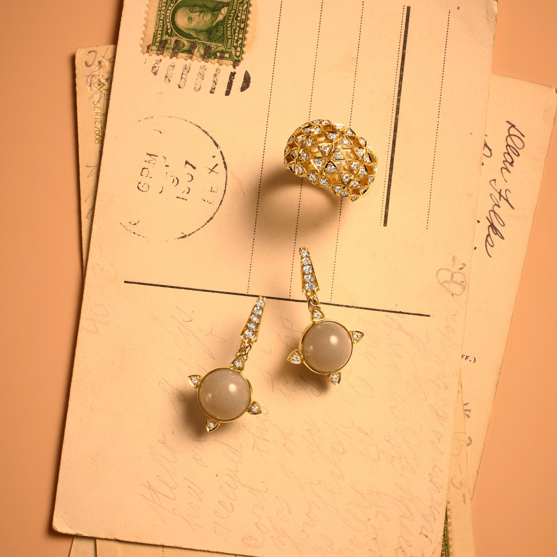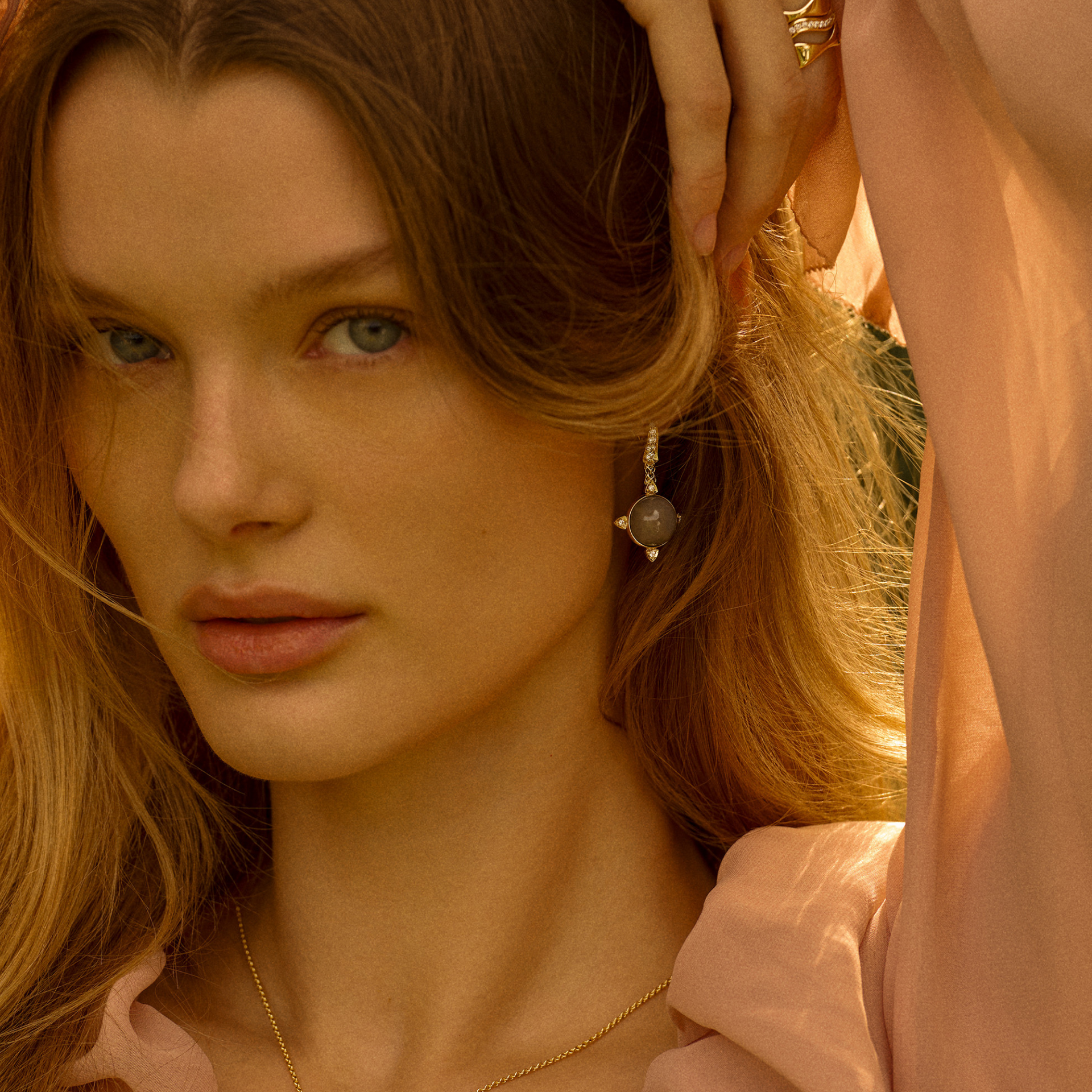 Suspended like teardrops of moonlight, the Lyra Grey Moonstone Dangle Earrings sway with quiet poetry. Each earring, adorned with a soft bead of moonstone and surrounded by four points of trillion diamonds, moves with a gentle shimmer.