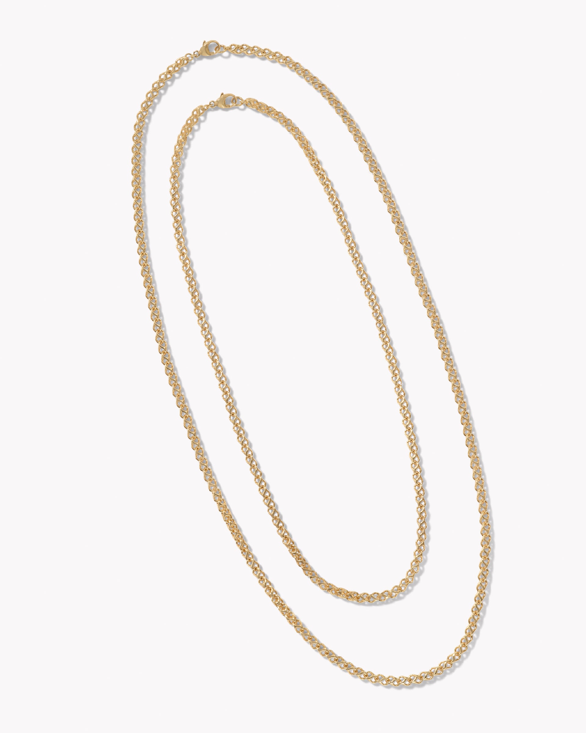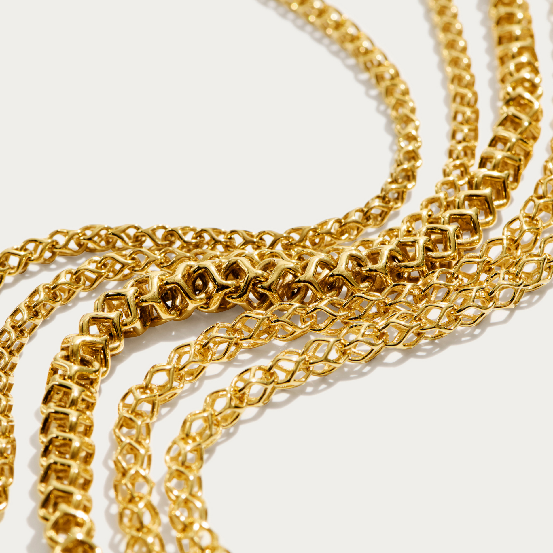 Golden teardrops in motion. Inspired by the falling oak leaves in Autumn, the Perry Chain is a series of interconnecting 3D diamond patterns. Perfect for layering with any look.