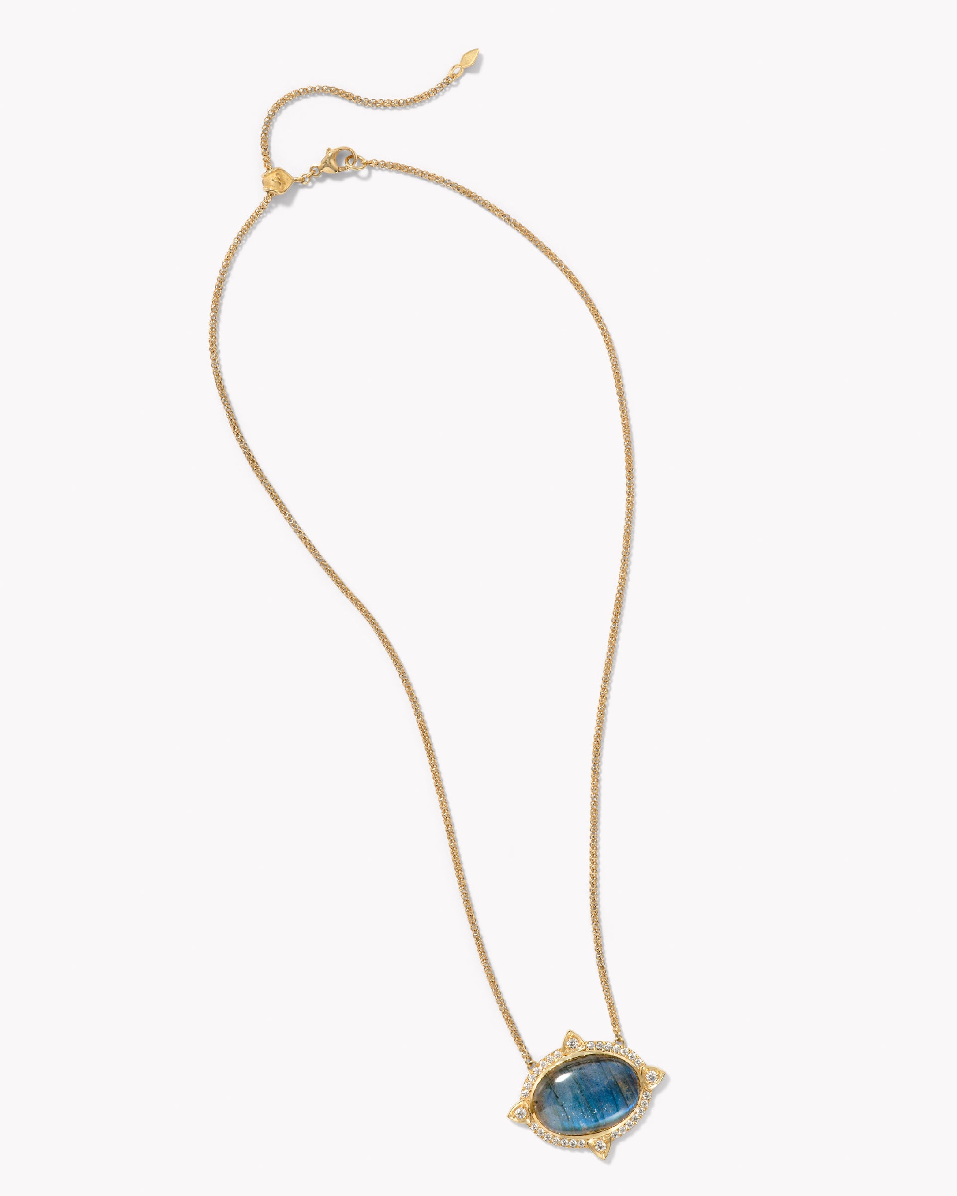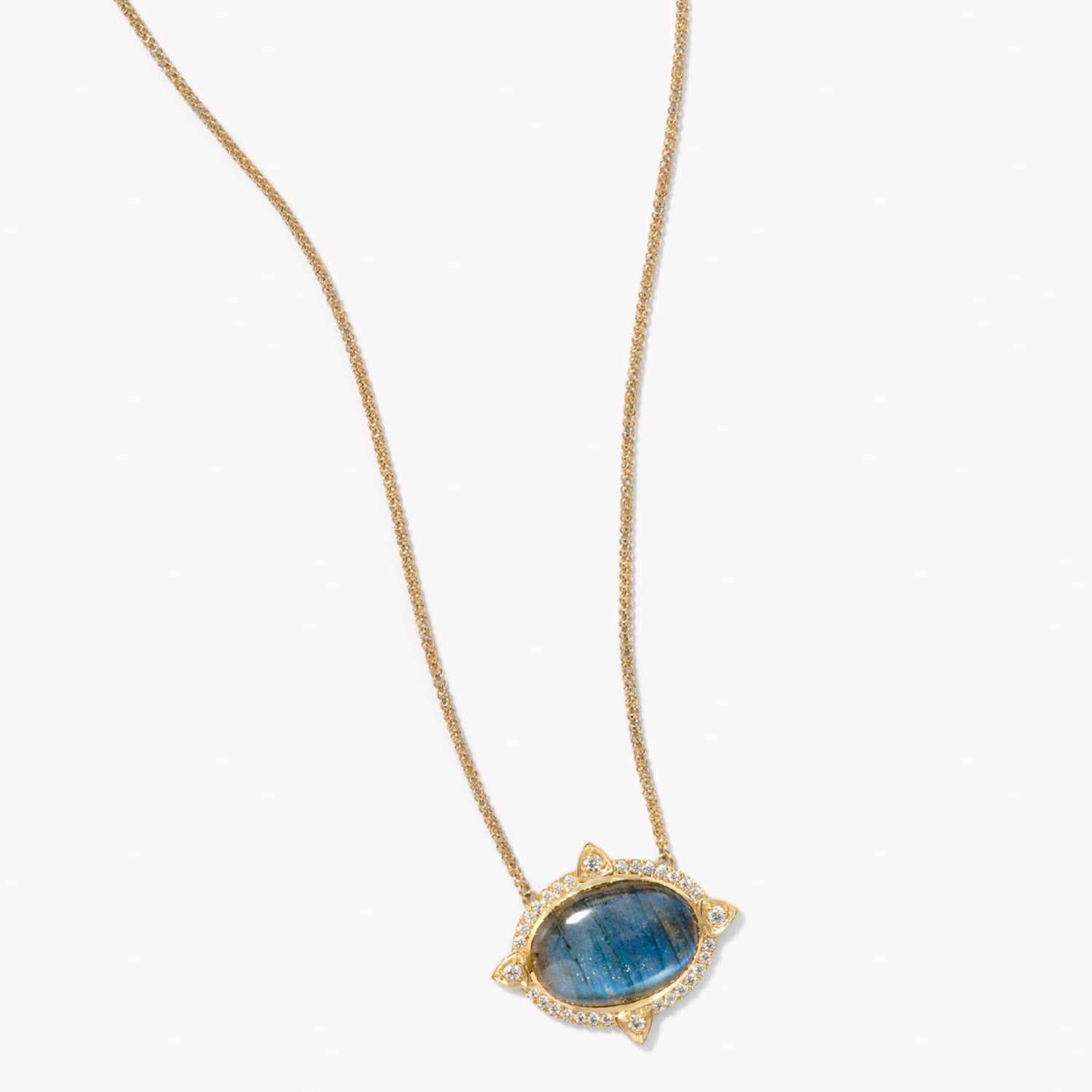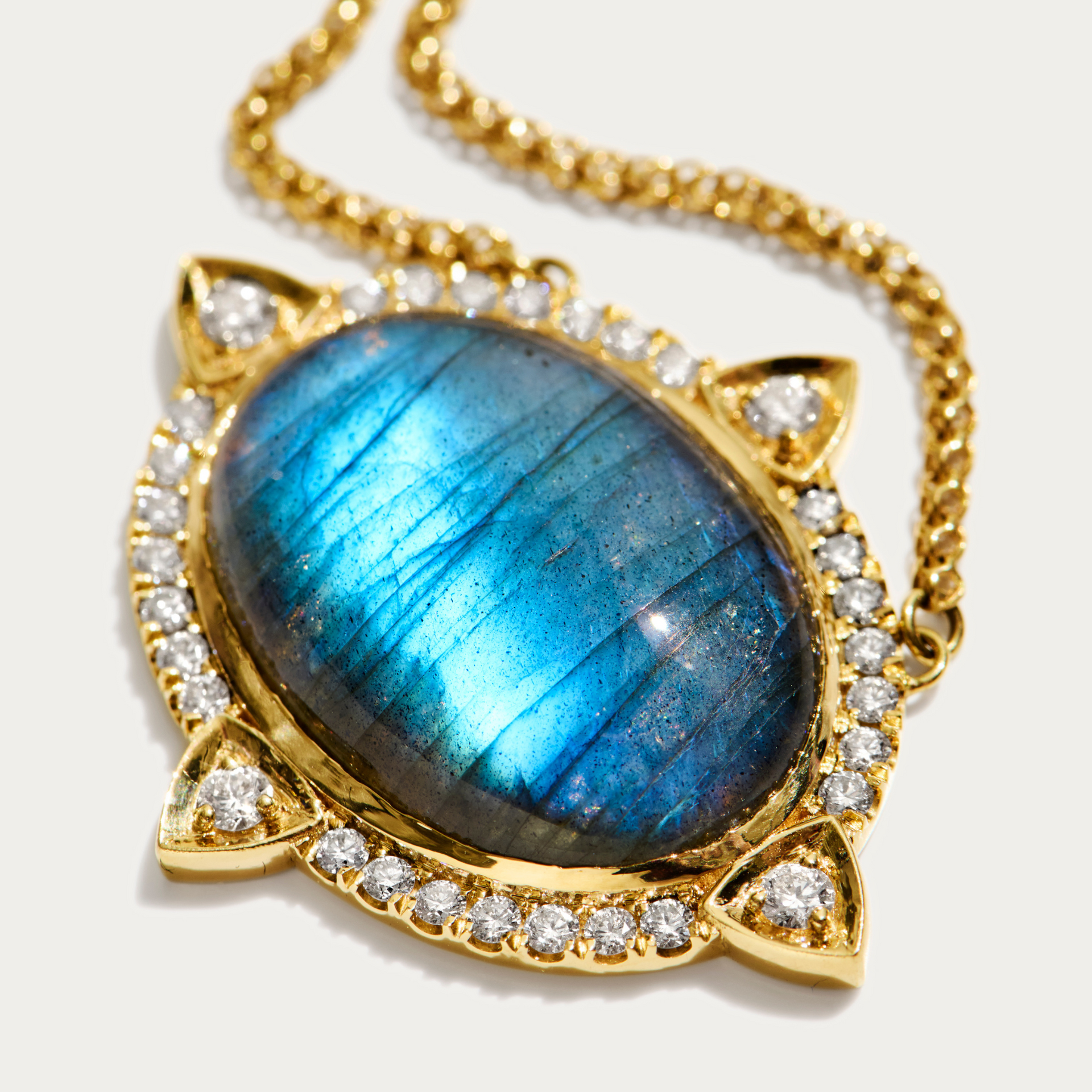 Captured ocean tide, framed in the sun of 18k gold and diamonds, the Reverie Labradorite Pendant is a crown of the depths. Shifting between deep, stormy blues and flickers of shimmering waves, the necklace holds the mystery of far-off shores.