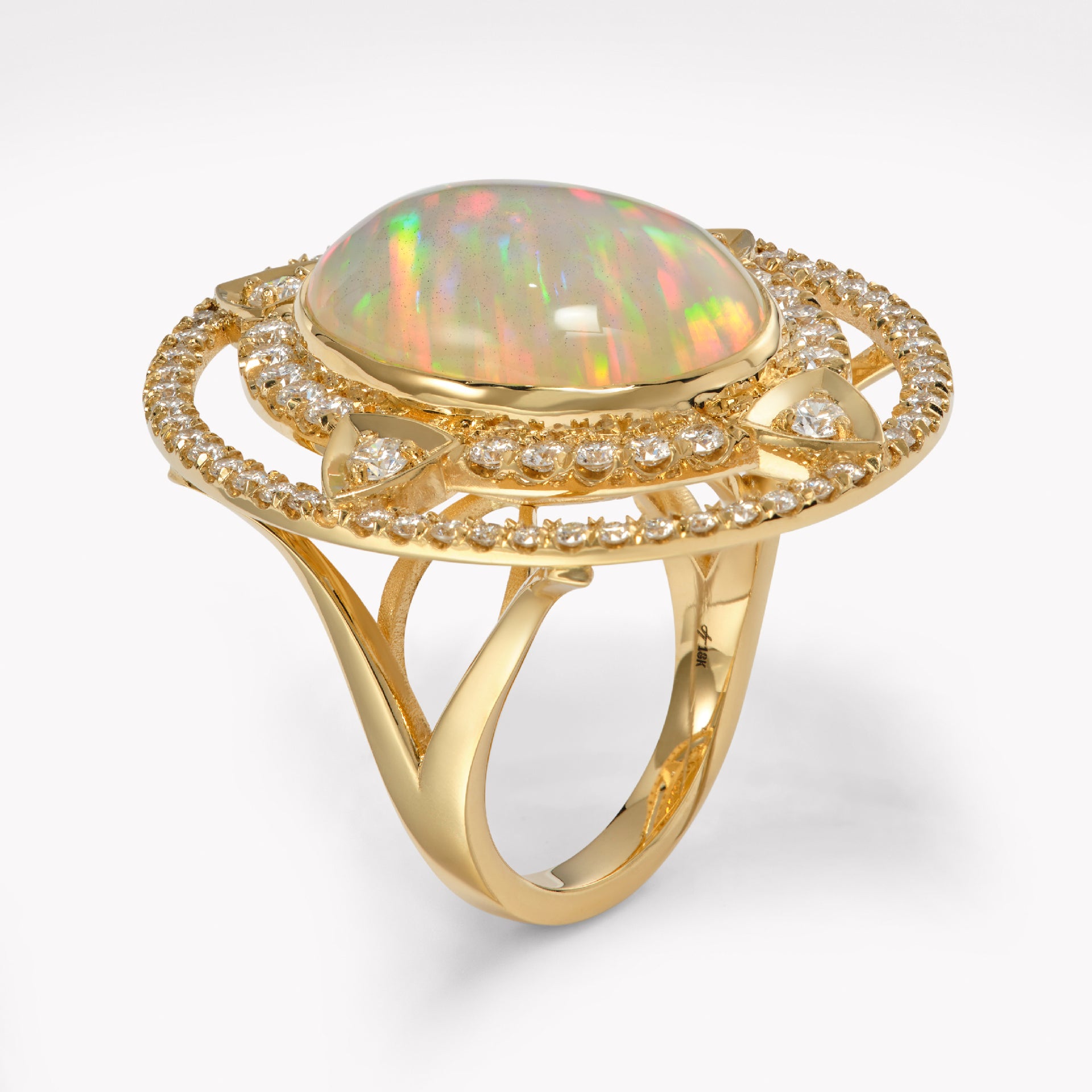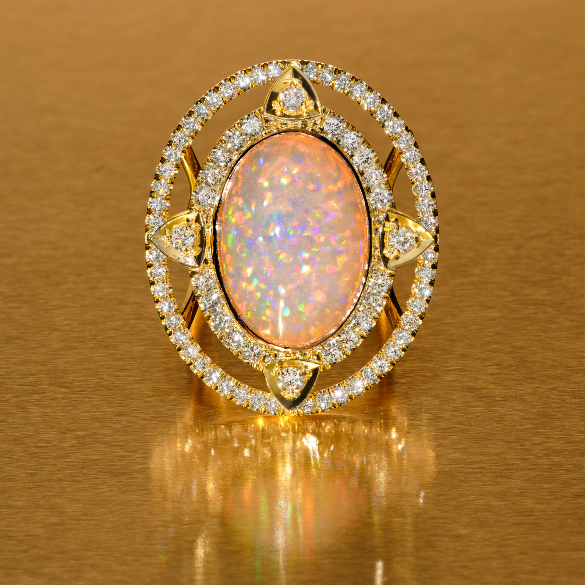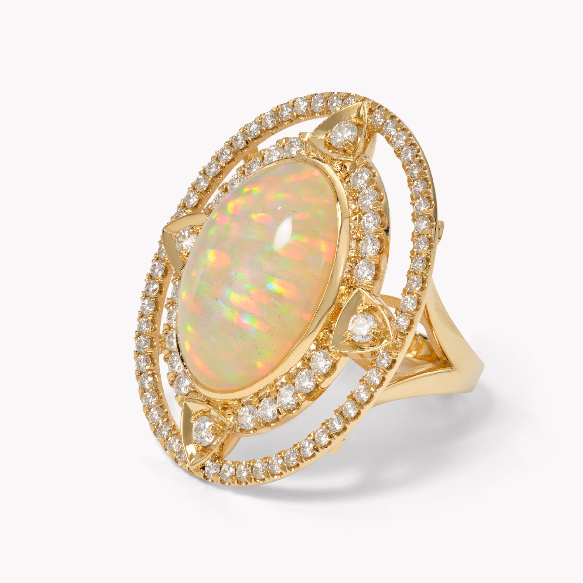 Blazing with the passion of a solar flare, the Opal at the heart of this ring shimmers with fire-kissed hues that dance like sunlight streaming across the cosmos. Encircled by 18k gold and diamond sparks, this is not just a ring, but a constellation of light.