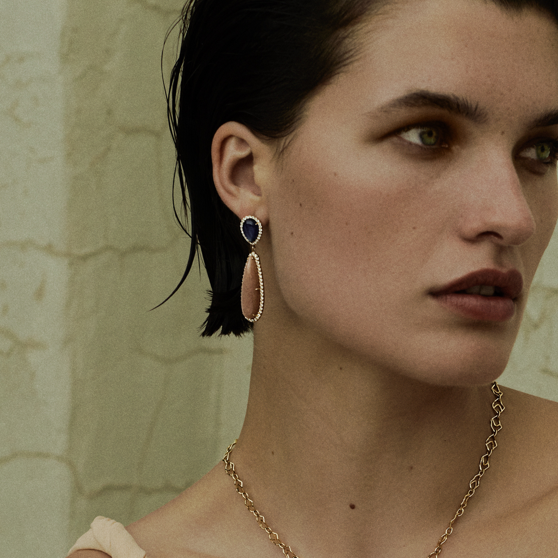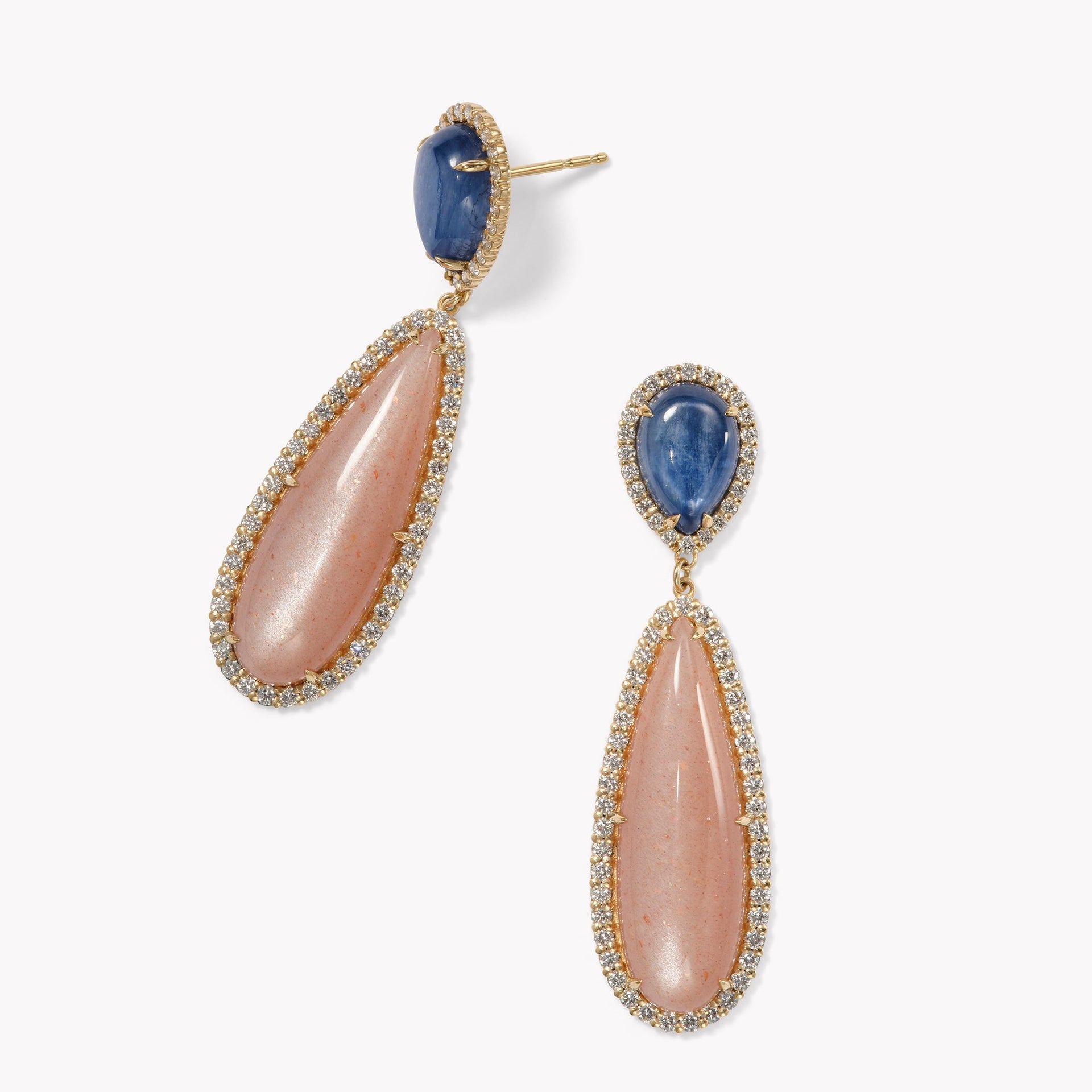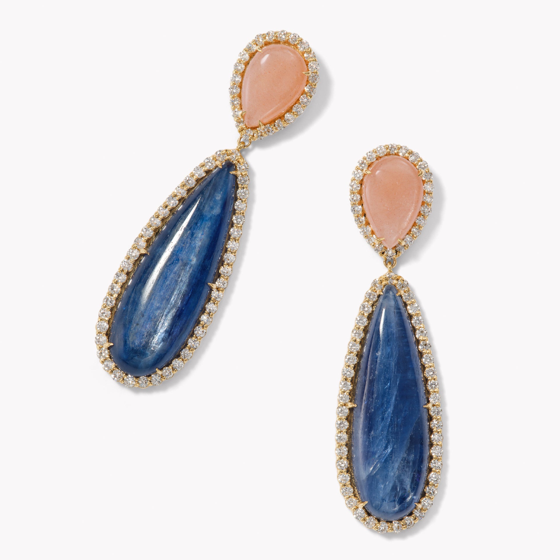 Dramatic and eye-catching, our Sparrow Drop Earrings are an artful statement. You're choice of color placement between two celestial Pink Moonstones and brilliant Kyanite pears all circled by handset diamonds.