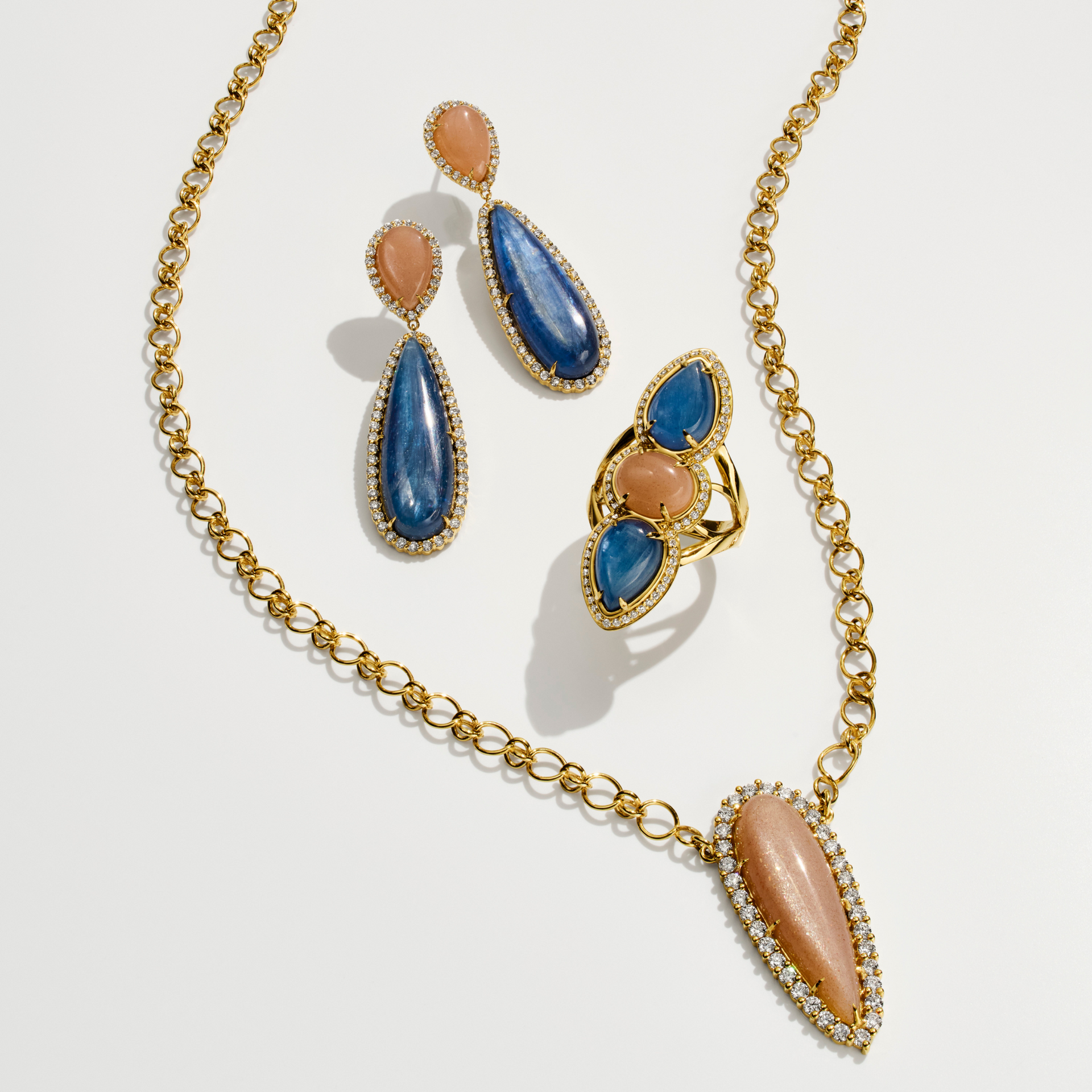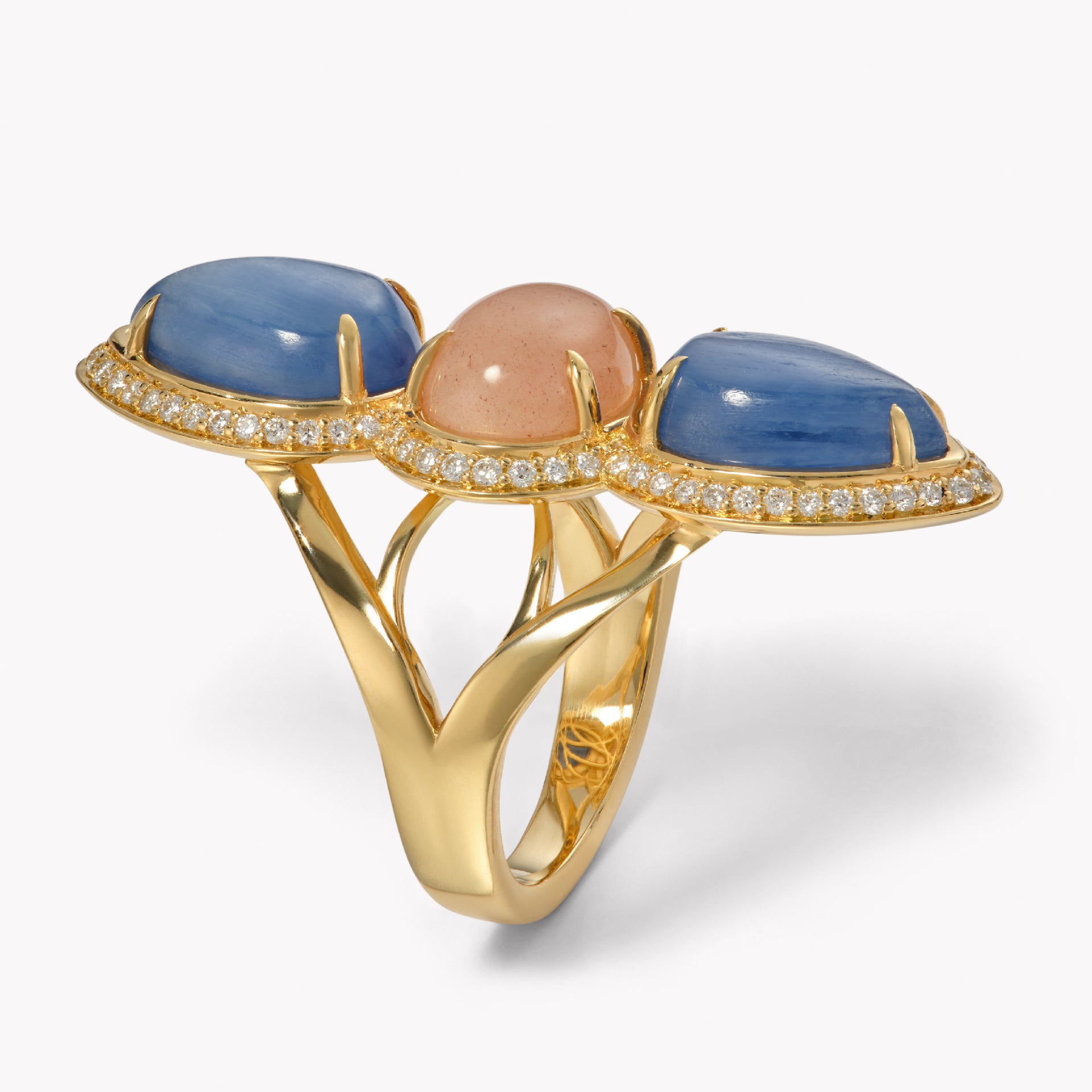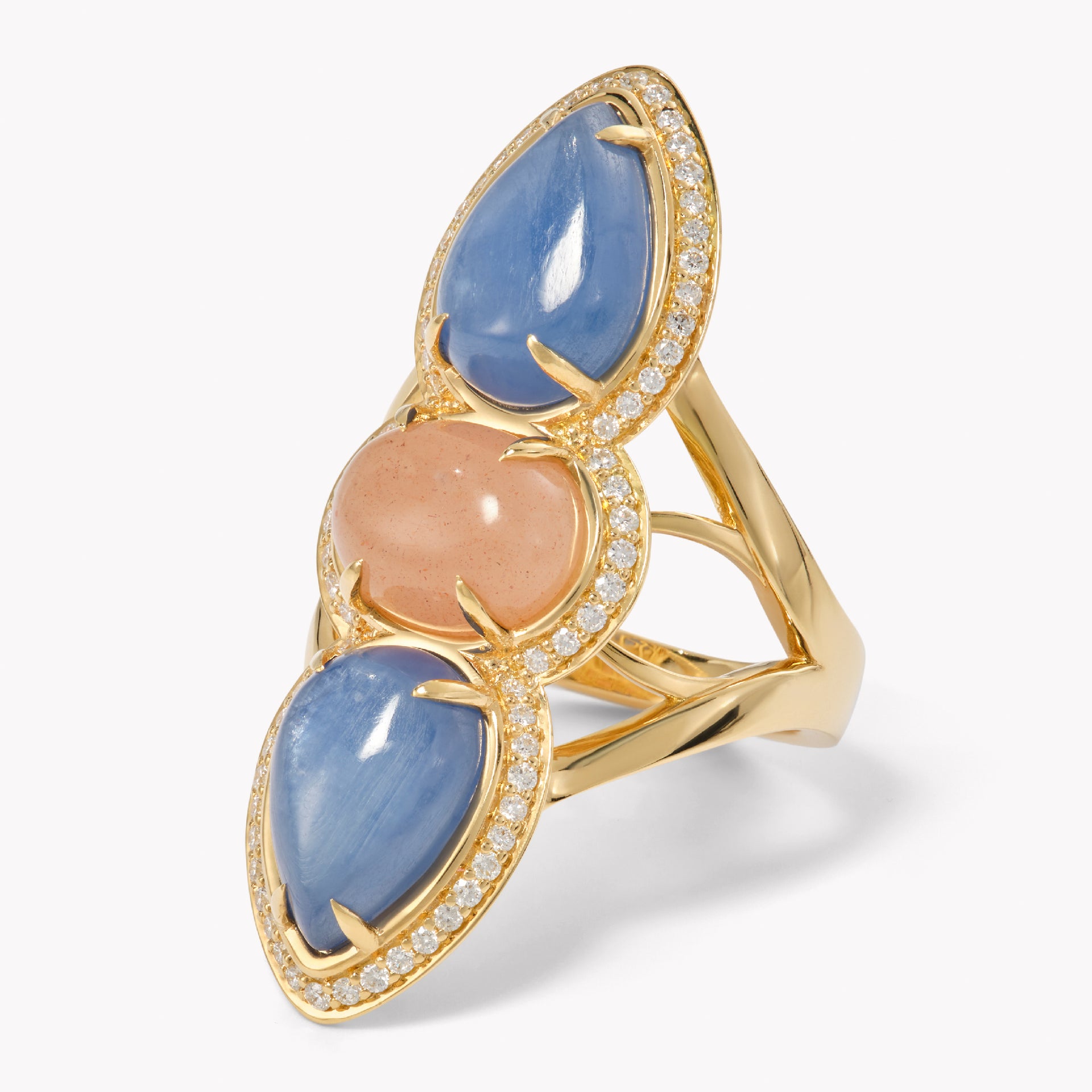 A tempest of twilight skies, where two deep, blue Kyanite stones rise like twin moons above a Pink Moonstone horizon. This ring's sculptural 18k gold setting wraps around the finger like a story to be told.