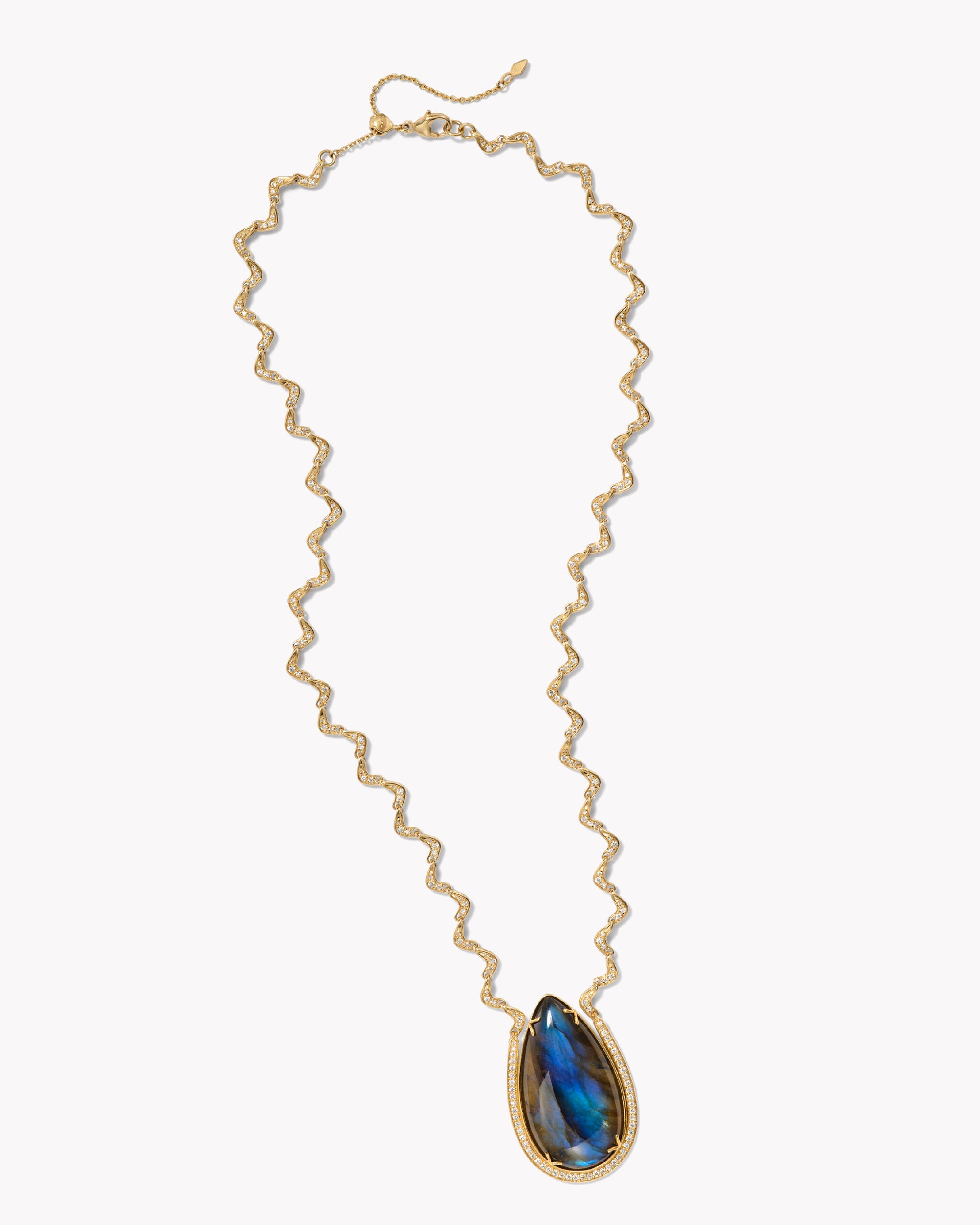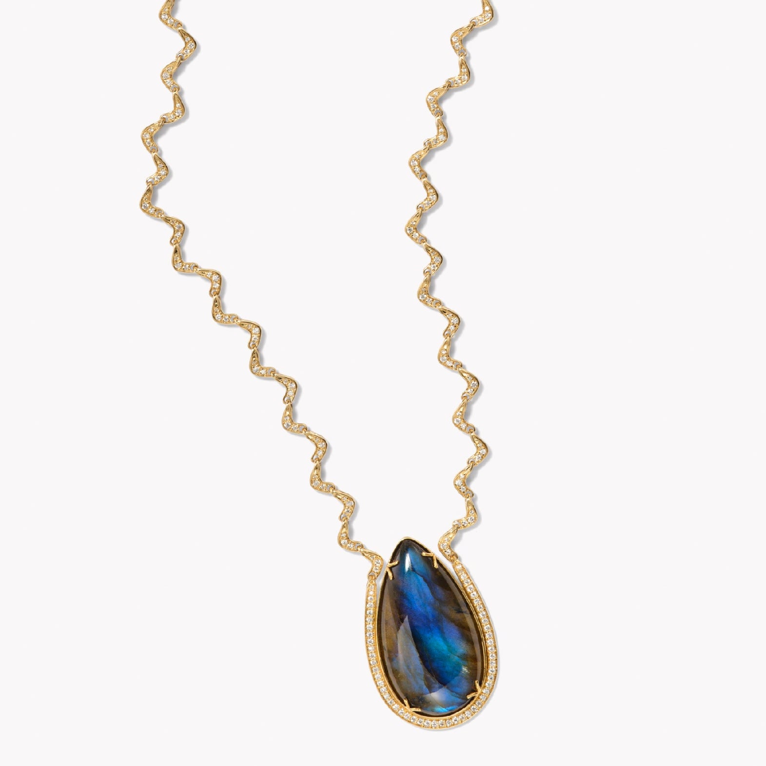 With its shifting flashes of iridescent blues, grays, and greens, the Labradorite stone gives this pendant a mesmerizing, one-of-a-kind allure—no two are ever the same. The curved halo of beautiful diamonds adds a dazzling sparkle to this spirited pendant.